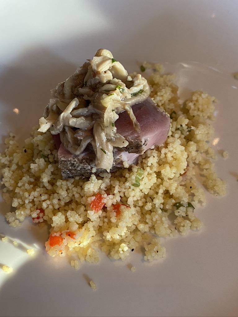 Seared yellow fin tuna with Shore Farms spring onion red pepper couscous & Gnomestead Hollow mushroom relish