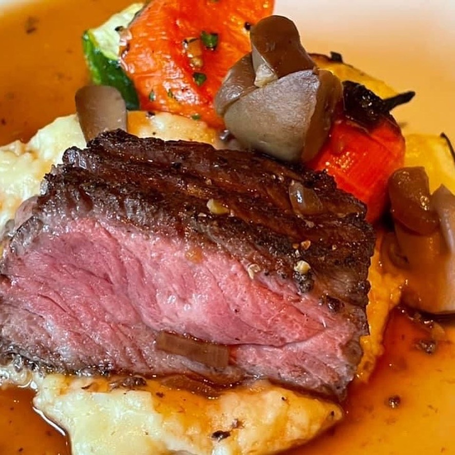 Steak au poivre garlic mashed potatoes fire roasted vegetables wild mushroom cognac sauce