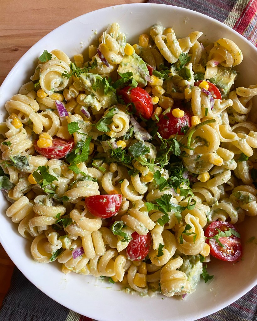 Who doesn’t love a pasta salad with a light, yet creamy dressing? This herby salad has it all. Better still, you can make your own creamy dressing (think Greek yogurt, cilantro or other herbs, lime, s/p) or just use your favorite ranch. I used a Sriracha Ranch from a local restaurant, F.A.R.M Cafe in Boone. The dressing from the squash salad above would be fab with this. The salad is terrific the next day.