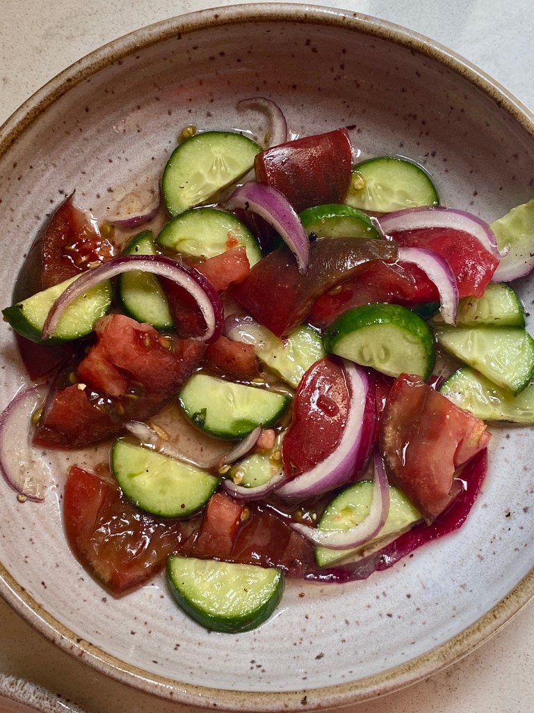 Inspired by Chef Vivian Howard and her cookbook, Deep Run Roots, this memory triggering salad reminds me of dinners at my Grandma’s. The cookbook re-introduced this perfect salad to me and provided the ratios too. Enjoy the colors and crispness with BBQ, ribs, burgers, fried chicken or really any dish. It adds the perfect amount of acid and freshness to your meal. And as she states in DRR, the recipe is highly adaptable for adding all kinds of seasonal freshness, from watermelon to corn to blueberries and peaches. You can add a boiled egg and call it brunch and I’ve happily done so.