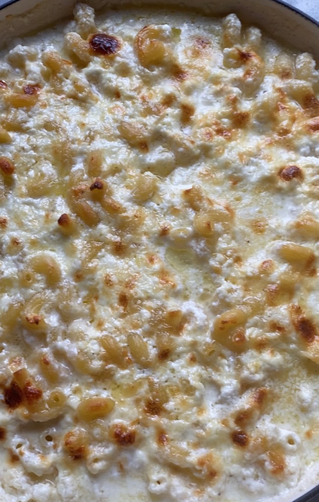 This mac & cheese reheats well with a little bit of cream to loosen it up and fresh crushed bagel chips on top.